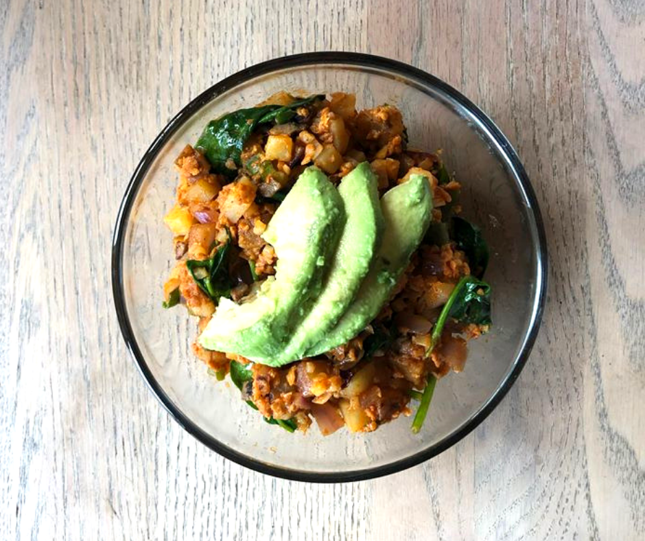 This is a nice mishmash of ingredients, that make for a tasty ass breaky. Eat this by itself, stuffed in a burrito or as tacos! Don’t forget to top with cilantro and avocado, make it good good.