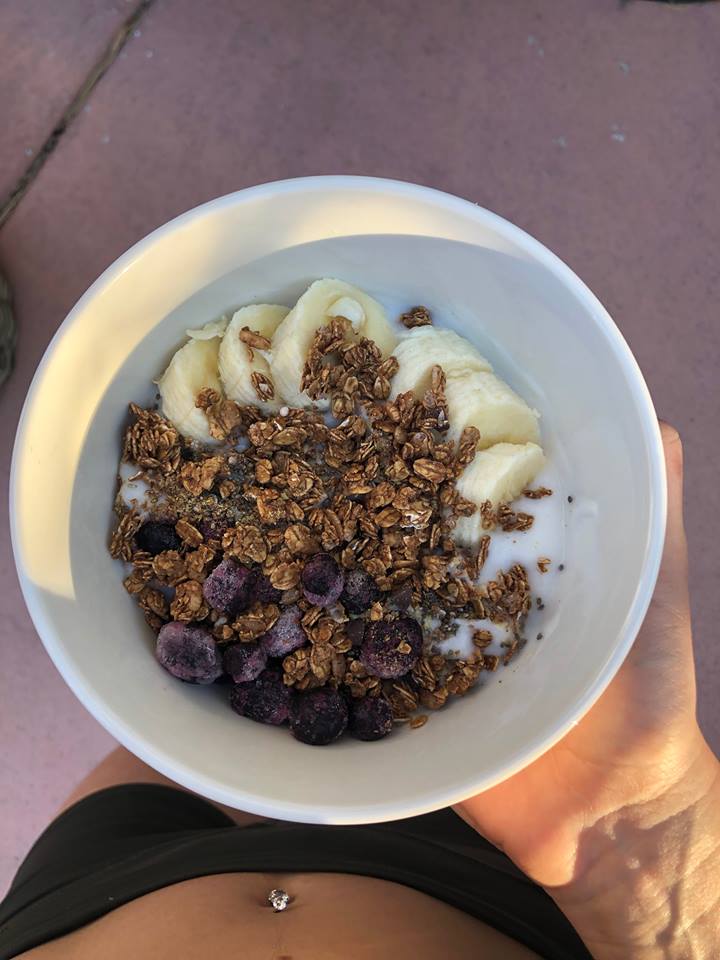 - Start with a base of yogurt, 1 serving size is usually 1 cup, top with fruit, granola, ground flax, chia seeds, and honey if desired. Enjoy that sh*t.