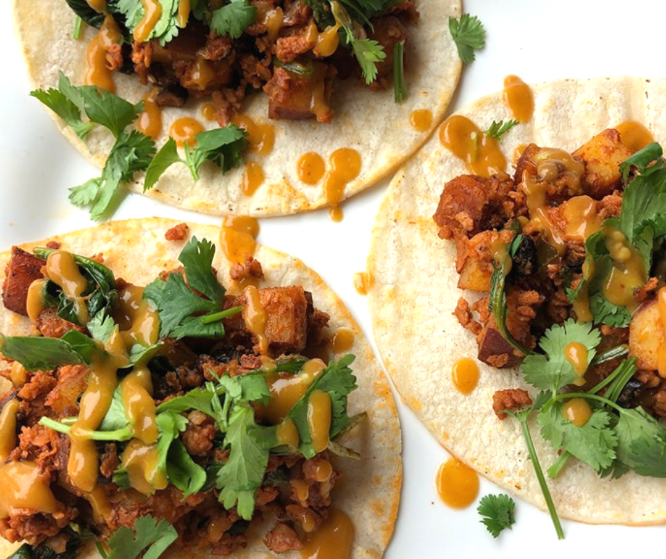 3. Check your potatoes and see if they are tender by using a fork to pierce them. If not, do five minute increments of letting them cook and flipping with the spatula. Add in the soyrizo when the potatoes are ready, stir and cook about five minutes. Now for your spinach, fold it in until they’ve all wilted down about 30 seconds to a minute. It’s ready to stuff in some tortillas!