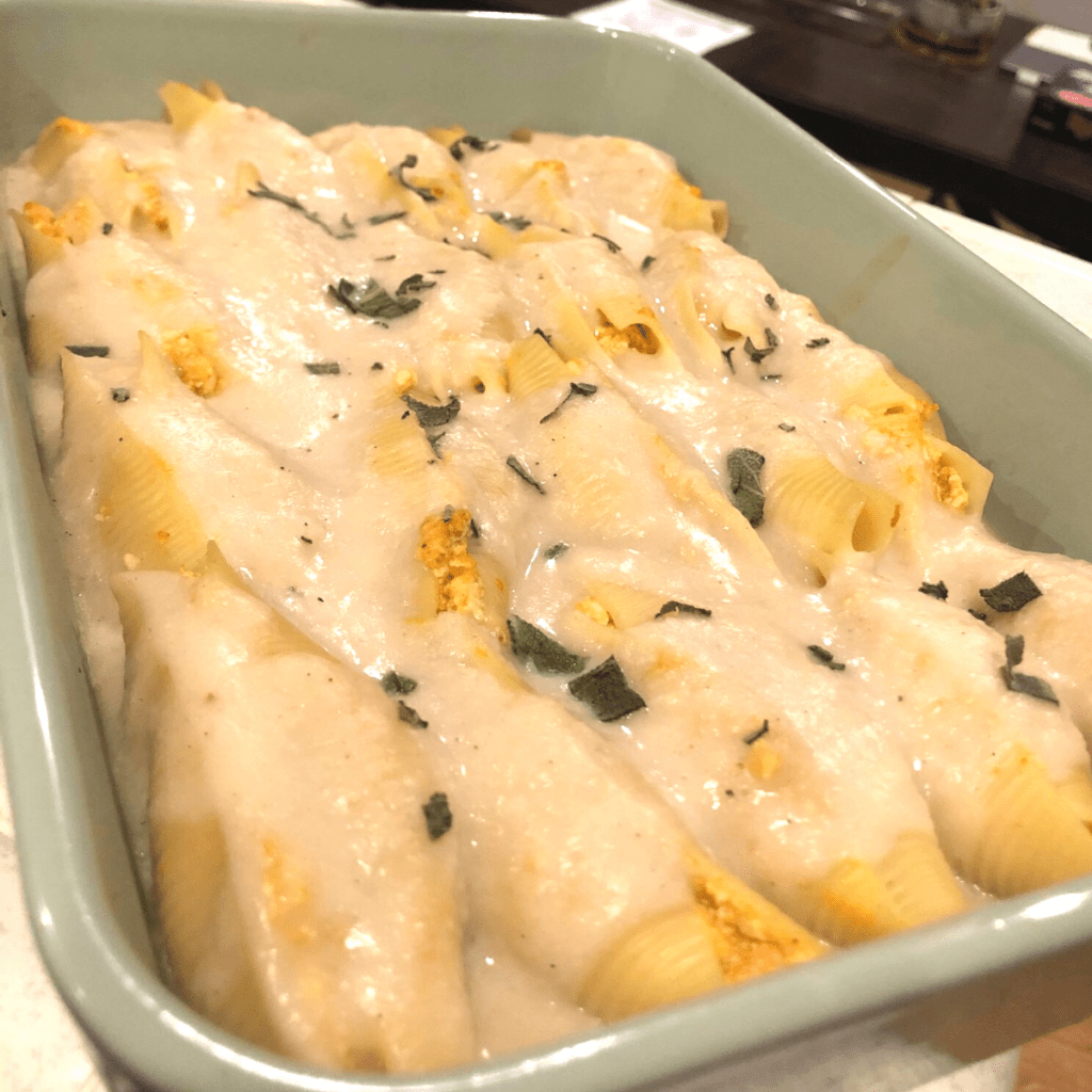 It has been some time… this whole covid shutdown has had me distracted in a weird way, even with mostly everything closed. My boredom finally led me back to cooking again, which led me here. And back with a kick-ass stuffed shell. Pumpkin ricotta filling for all you basic bitches out there. Topped with a super delicious garlic alfredo sauce… I suggest making double because you can make fettuccine alfredo for “Pasta Night: Round 2”. This lovely recipe is as seen on Rainbow Plant Life, and made by the lovely Nisha.