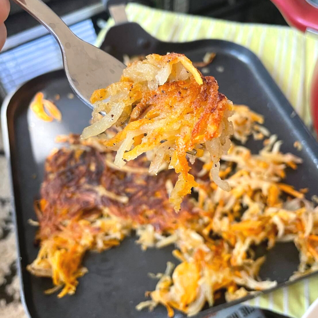 If we were to become our favorite foods… I’d be a potato. I f*cking love all things potato. And my favorite potato dish is hash browns, so naturally I’m here posting about hash browns. When I lived in New York, my first year of college, I was poor af (like most college students I think?) and came to know the server at a café I would go to all the time since it was pretty cheap. I told him this particular morning I didn’t have much and if he could hook it up with some hash browns for $5. He said “No problem,” and brought me a casserole sized tin for a lasagna or eggplant parm out packed with potato gold. I couldn’t believe how f*cking amazing that guy was. And every time I came back he would do the same thing. The hash browns, by the way, were so mother lovin’ good.